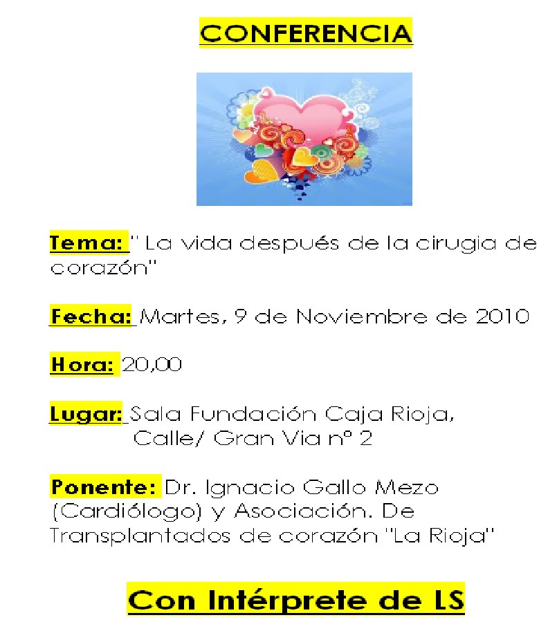 131. CONFERENCIA "LA VIDA DESPUÉS DE LA CIRUGÍA DE CORAZÓN" Publicado por A.S.R. el octubre 30, 2010 Obtener enlace Facebook X Pinterest Correo electrónico Otras aplicaciones