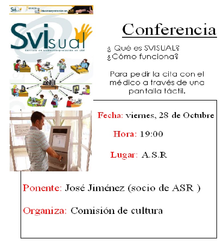 180. CONFERENCIA SVISUAL (SERVICIO DE VIDEO INTERPRETACIÓN DE LENGUA SIGNOS) Publicado por A.S.R. el octubre 22, 2011 Obtener enlace Facebook X Pinterest Correo electrónico Otras aplicaciones