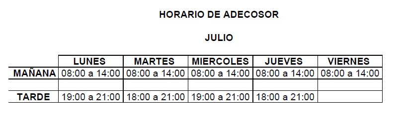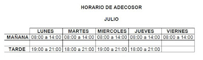 Publicado por A.S.R. el junio 30, 2015 Obtener enlace Facebook X Pinterest Correo electrónico Otras aplicaciones HORARIO DE ADECOSOR EN EL MES DE JULIO